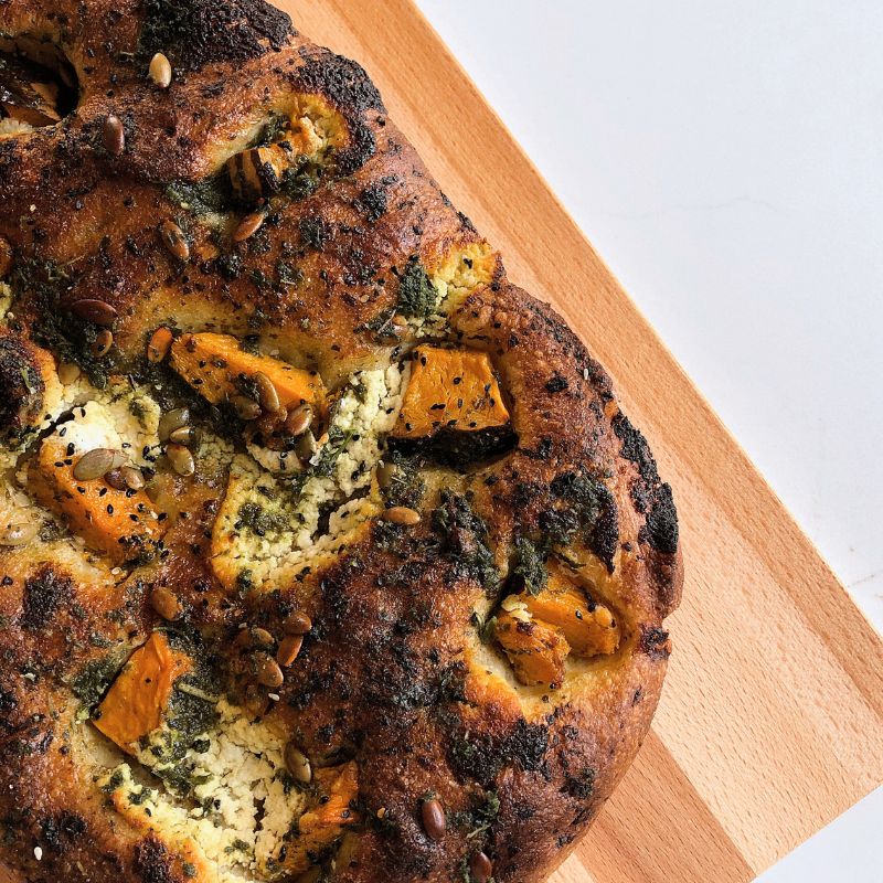 I like my focaccia to be warm and crunchy, so I usually throw mine back into a preheated oven (approx. 180 degrees C) for about 10-15 minutes. You can definitely eat it fresh, but I’d recommend heating it a little if it’s a day old.