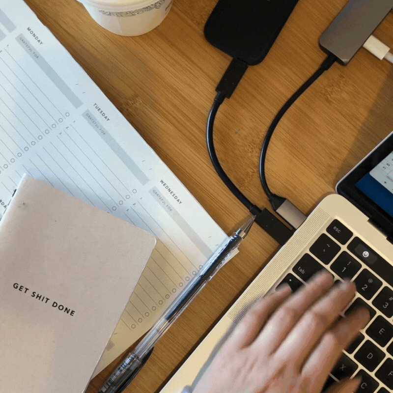 Pictured from bottom left: MIGOALS ‘Get Shit Done’ A6 notebook (half to-do list, half notepad); MIGOALS weekly desk pad; SanDisk Extreme 1TB portable drive (I use this and save to the cloud); and Satechi USB-C Slim Multi-Port Adapter.