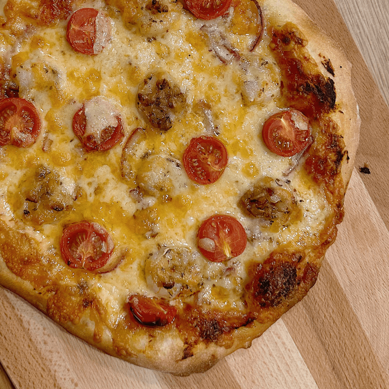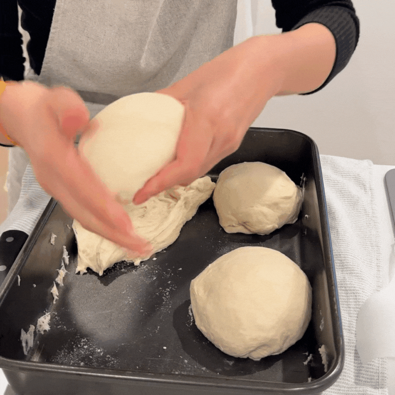 FYI – I’m not a pro, so don’t come at me about my approach! 🥲 I’m still figuring things out… I let the dough stretch naturally in the air as much as possible without it ripping. Then I press out the centre on the tray so it’s nice and thin. I leave the crust a little thick so it can rise more.